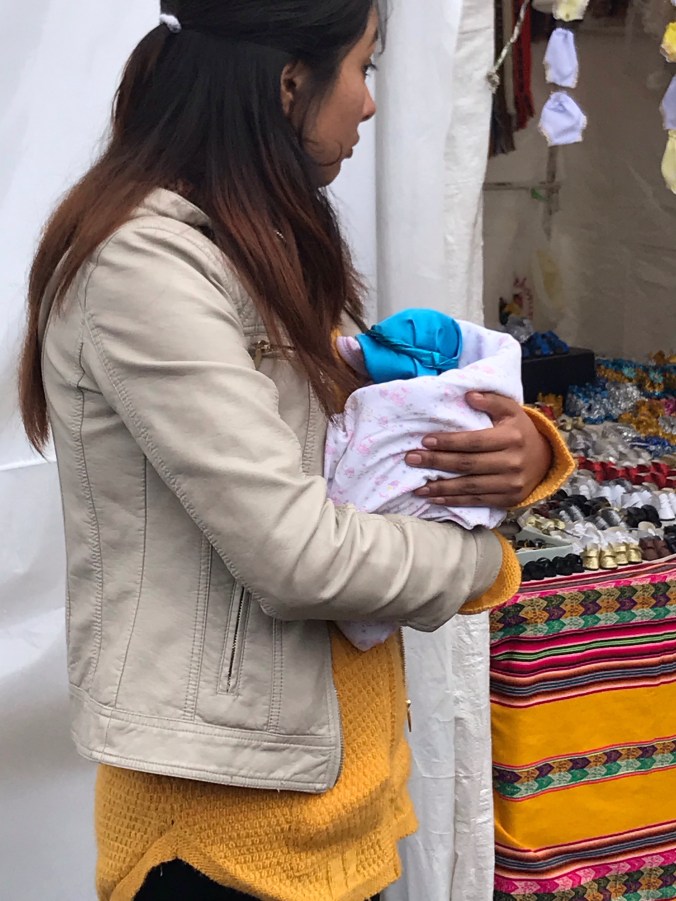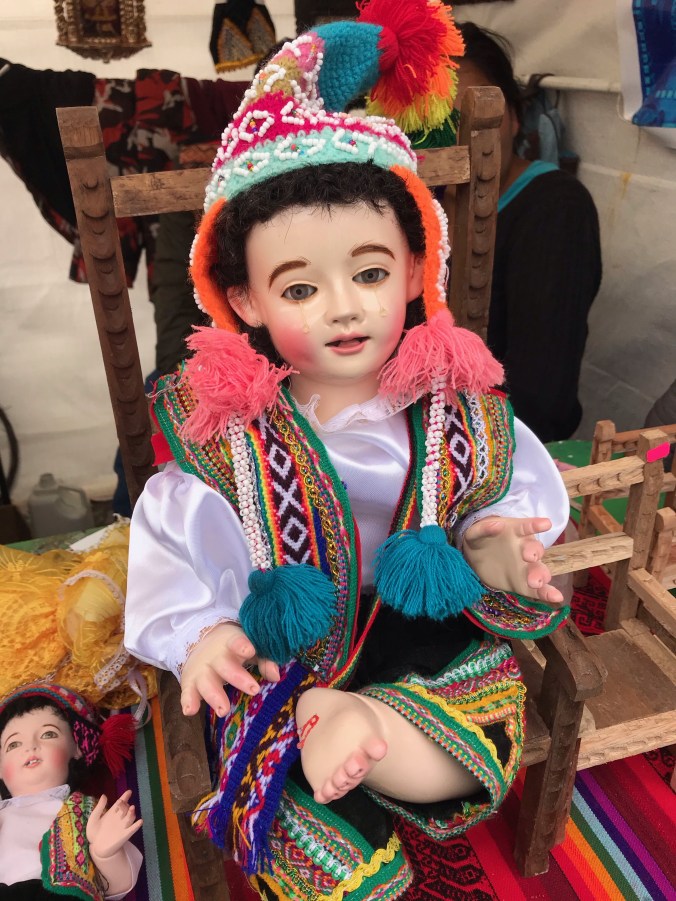 When I walked into the San Pedro plaza, I noticed all of these stalls selling baby dolls with clothing accessories. Was this a Peruvian souvenir I wasn’t aware of? So I asked. What was the significance of the dolls? Well, the sixth of January is the three kings day. Since the fifth was the Sunday before, everyone brings their baby Jesus doll (dressed with accessories) to church. In all honesty, these dolls are seriously creepy, but I was getting a huge kick watching people cart their Jesus doll around like a real baby. Cusco is 80% church going catholic. Imagine how many baby Jesus’ make it to church.